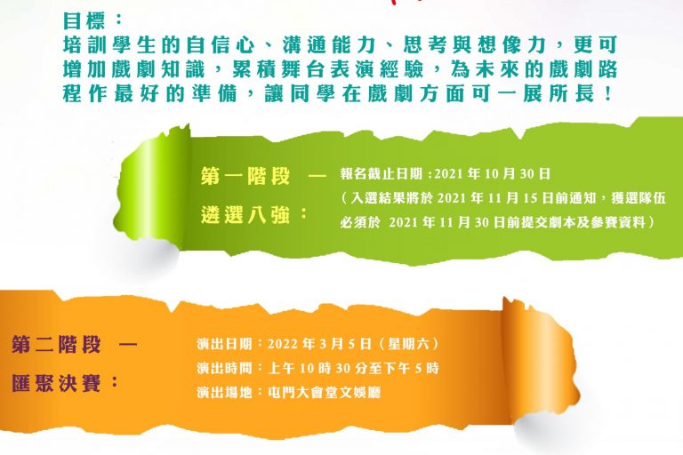 9 月92021 2022 新界西小學戲劇匯聚比賽 比賽作者:POP Theatre9 9 月, 2021 「新界西小學戲劇匯聚比賽」能培養參賽者的自信心、溝通能力、思考能力、想像力、分析能力以及團隊合作精神。入選的學… 了解更多